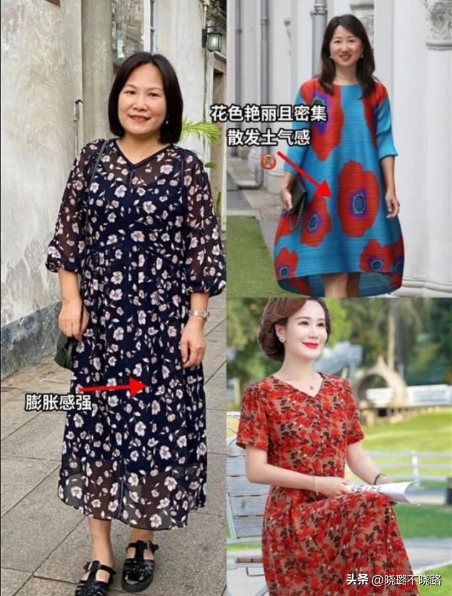 「大媽裝」的刻板印象,往往源於那些底色深沉、花朵碩大且密集排列的碎花裙,或是熒光粉、寶藍、翠綠等高飽和度的亮色裙。大朵密布的印花視覺上極其膨脹,不僅顯胖,還容易顯得土氣;而高飽和度的顏色對膚色要求極高,五十歲女性的皮膚普遍偏黃或暗沉,穿上這些顏色只會顯得臉色蠟黃,瞬間老十歲。真正的優雅,是做減法,而非做加法。