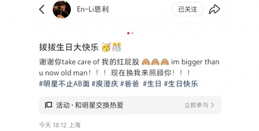 7月29日晚間,伊能靜兒子哈利在個人社群帳號曬出兩張爸爸庾澄慶的照片,發文為爸爸慶生。哈利寫道:「拔拔生日大快樂」,他還幽默稱感謝爸爸照顧兒時他的紅屁股,真是可愛爆棚了!