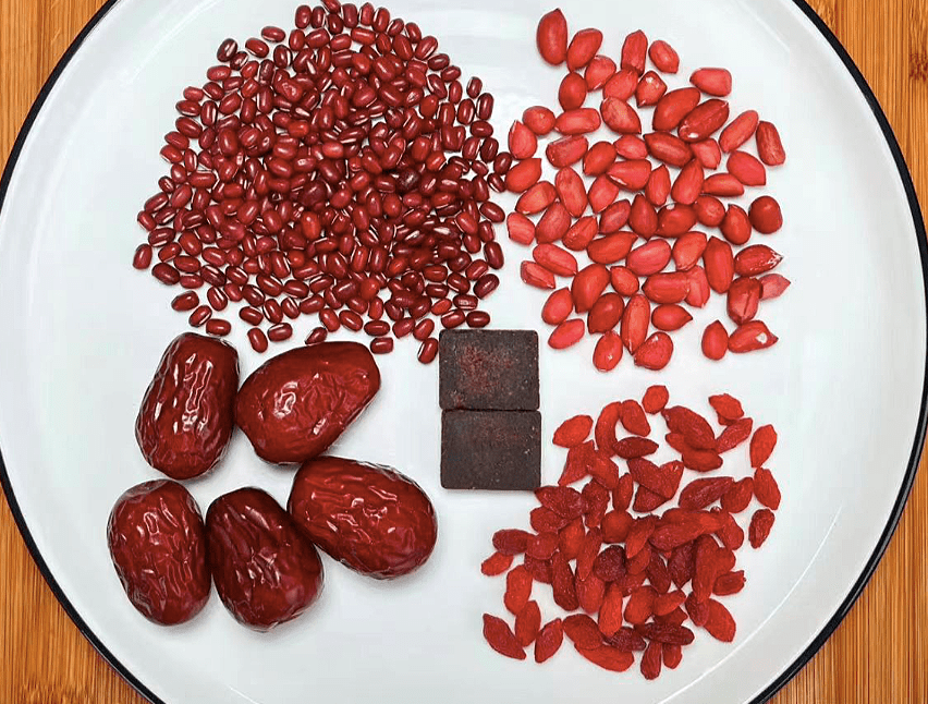 這裡的五紅指的是五種紅色的食材,分別是:紅棗、紅糖、紅衣花生、紅枸杞,都是對女性非常友好的食材。