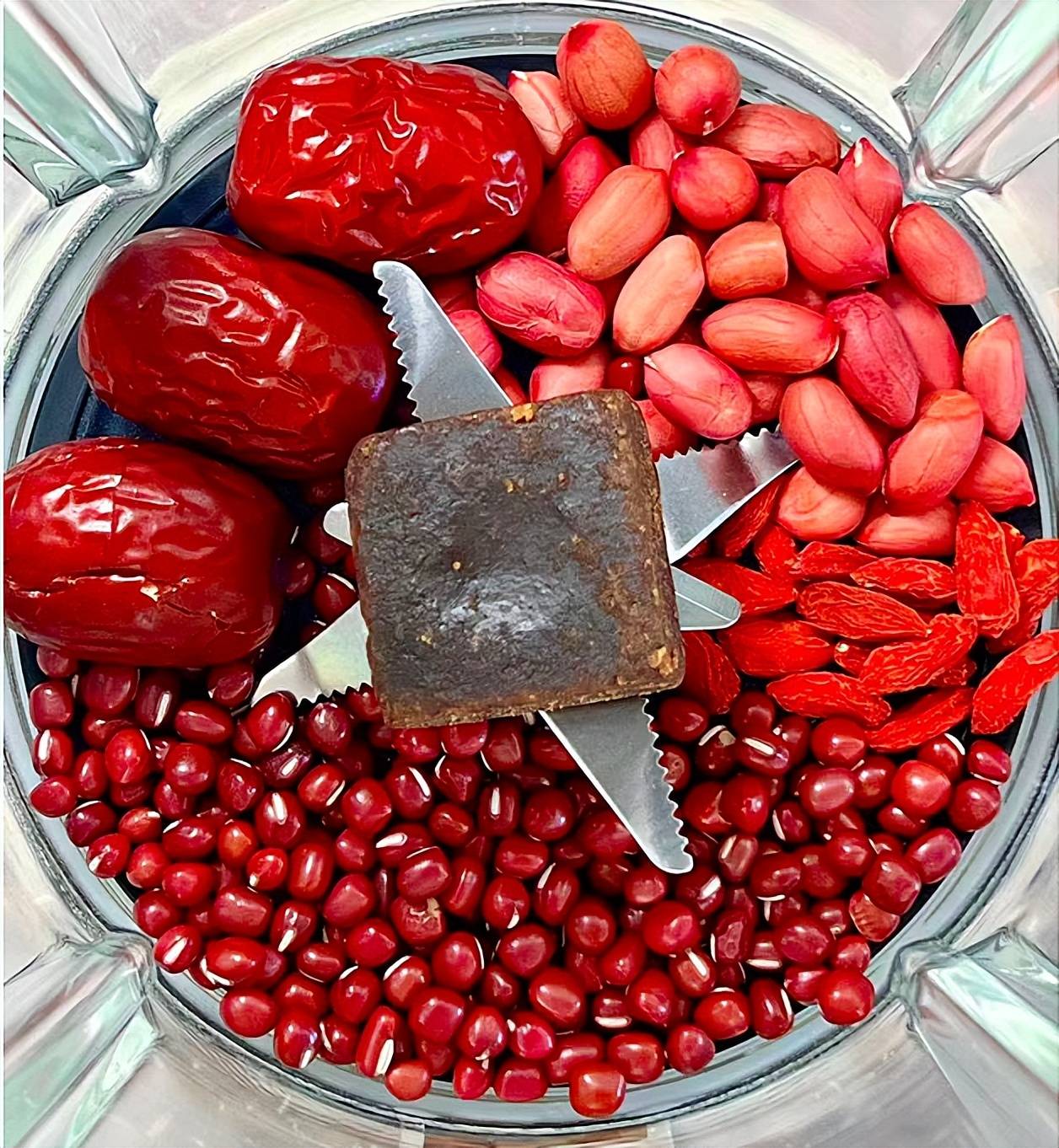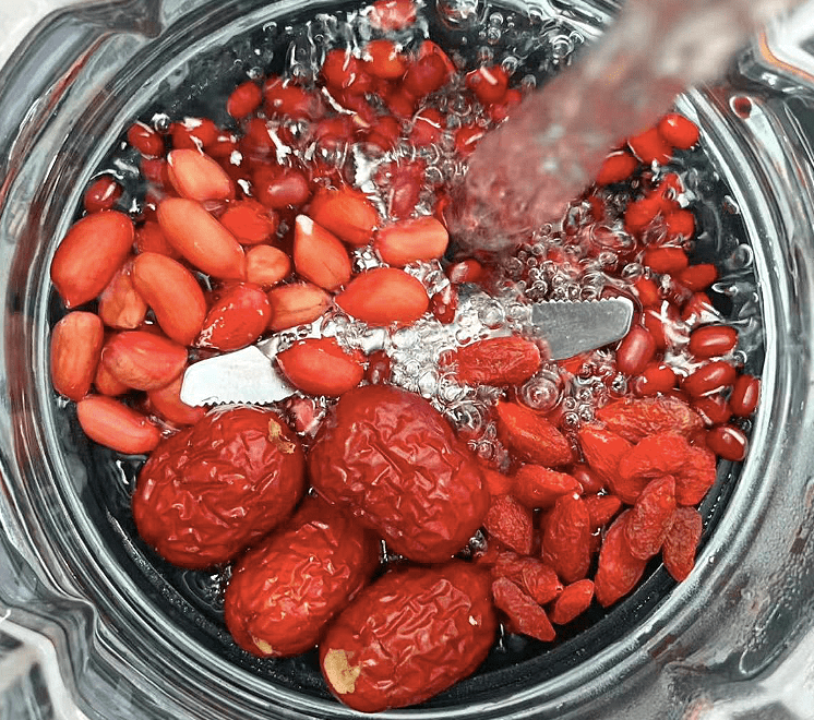 3、把準備好的紅棗、紅豆、花生、紅糖、枸杞一起放入破壁機里。