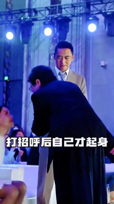 只見畫面中一位友人上前,似乎想向發哥致意並且聊上幾句,然而專心享受現場氛圍的發哥,似乎並未留意到一旁的友人,此時發嫂見狀,默默地轉頭用左手輕拍周潤發,示意他有人來了,發哥立刻很有默契的轉頭,接著起身迎賓。