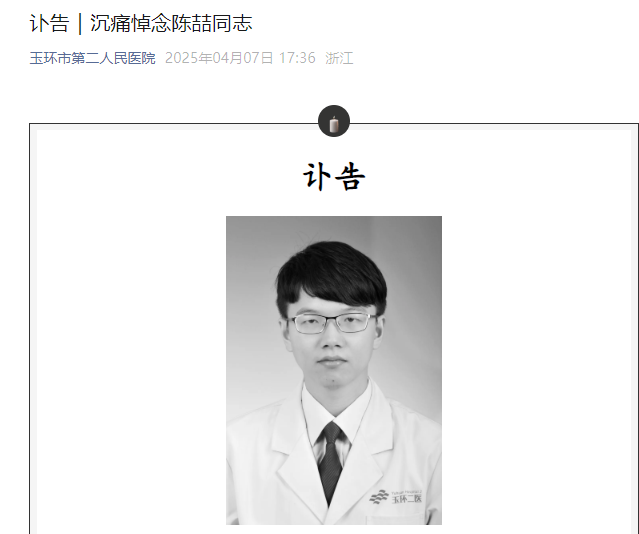 目前,玉環市第二人民醫院已於4月7日晚發布了陳喆醫生的訃告。