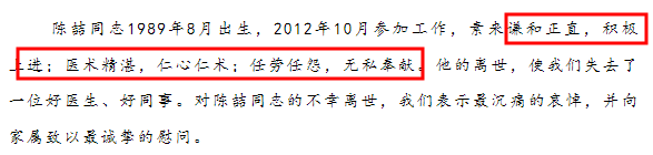 從玉環市第二人民醫院訃告中形容陳喆醫生的詞語中,我們也可以看出陳喆醫生很優秀,很拚命。訃告中寫著:積極上進,任勞任怨,無私奉獻。