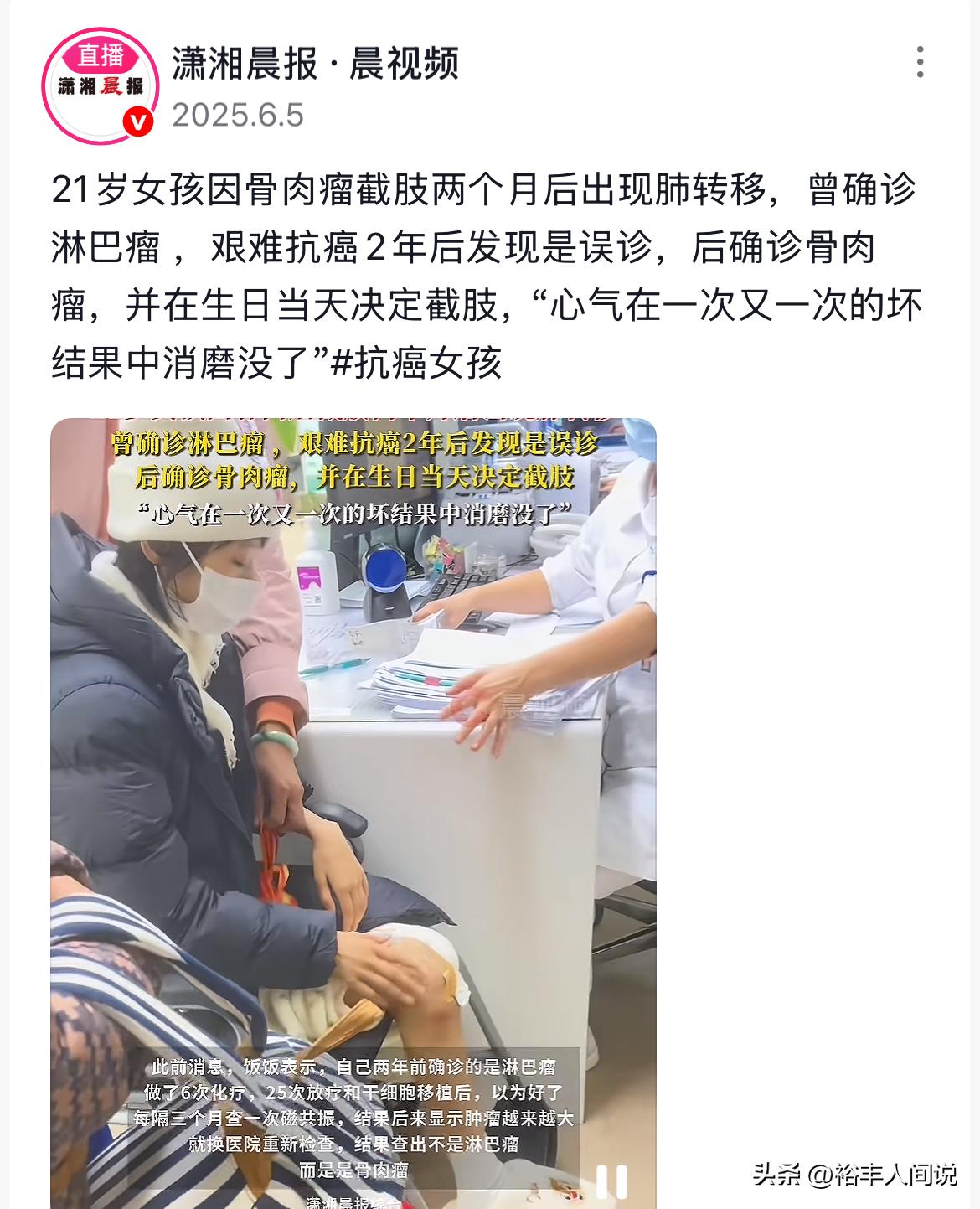 這期間,梁希怡不幸遭到了感染,過了幾天之後,腿疼到走不了路,這才在爸爸的帶領下前往醫院檢查,起初懷疑是骨結核,但並不確定,在其建議下前往大醫院檢查,權威醫生看過之後,便確定有腫瘤。
