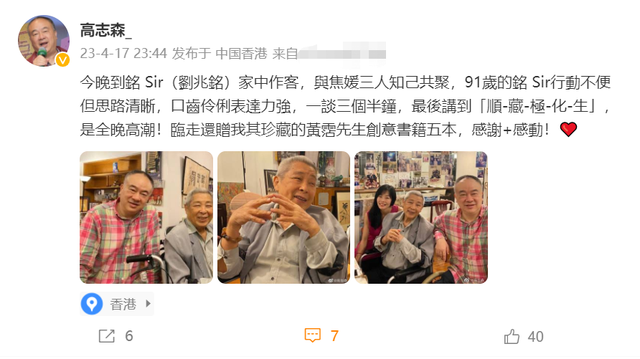 據高志森透露,他與焦媛去了劉兆銘家裡作客,當時91歲的銘Sir雖然行動不便,但思路仍清晰,口齒也很伶俐,表達能力強,大家足足聊了3個半小時。臨走前,銘Sir還大方贈送他5本黃霑創意書籍,他真的很感動。畫面中,劉兆銘與高志森以及焦媛一起出鏡,難得相見,彼此心情大好,對著鏡頭露出燦爛的笑容。