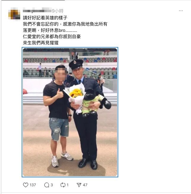 何偉豪殉職的消息傳開後,昔日並肩作戰的弟兄在社群平台貼出兩人合影,寫下「落更喇,好好休息bro,我們永遠不會忘記你」字句,讓眾多網友看了十分鼻酸,其中還有同袍透露,他入職9年,過去曾是機場警務人員,他原計畫下月與交往10年的女友結婚,如今卻天人永隔,未婚妻更曾在社群寫道「謝謝你,嫌我煩都要講100次愛你,以後都要笑得開心」,讓大批網友直呼心碎。