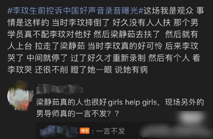 有網友透露,當時梁靜茹看到李玟無力地倒在地上,立刻上台要攙扶她,卻遭導演怒斥,節目組的工作人員也趕緊上台把梁靜茹拉走,只留下李玟獨自留在舞台上。在後來播出的畫面中,可以看到梁靜茹坐在台下時眼眶含淚,被認為她在心疼李玟。面對這些指控,製作單位火速發表聲明否認,並極力澄清是「遭惡意剪輯」,但仍未能平息事態。
