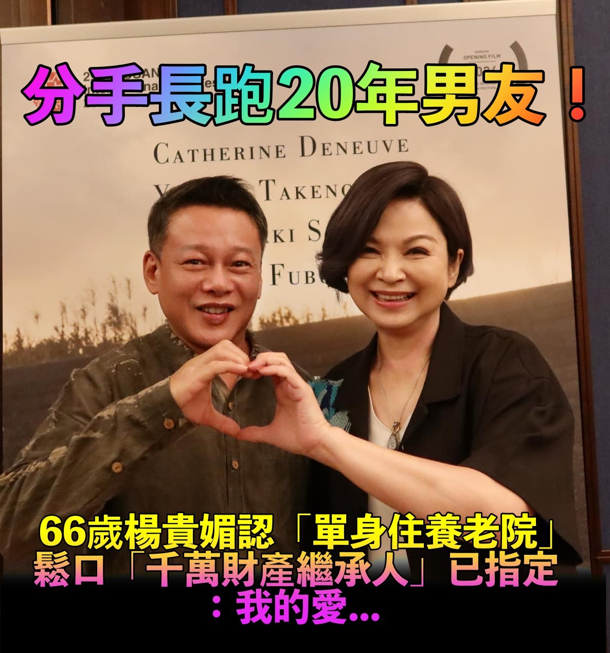 單身膝下無子!楊貴媚「認分手20年男友」想住養老院 「簽放棄急救」點名千萬遺產繼承人 人生夢一場 2026-04-17 檢舉 圖片來源:楊貴媚臉書如今66歲的楊貴媚,並沒有想再找伴,除了沒有多餘的心力,加上想到對方也要同時照顧她爸媽,因此打退堂鼓。孝順的她當提到媽媽的現況,則笑笑表示目前維持都不錯,不要退步就好,她也很珍惜與媽媽相處的時刻,即便身邊沒有另一半,但她身邊卻有像鍾欣凌等閨蜜的陪伴,生活也過得有滋有味。圖片來源:楊貴媚臉書她真的好孝順,做任何決定都不忘替家人著想!參考來源:三立新聞 Advertisements 回首頁 2/2 Advertisements 猜你會喜歡 昔為父還9000萬債!方季惟罹癌重生「歡慶59歲生日」 不婚不生「發現2顆腫瘤」笑喊:看淡一切 以為媽媽出國玩!包裹打開竟是「媽媽的骨灰罈」 女兒收簡訊才知「跑去瑞士安樂死」崩潰了 長照10年不喊苦!侯怡君為母「包尿布、接送侍奉」 怎料媽一開門竟「慘遭後車撞上」 編輯精選推薦 More + 大咖男星妹妹出嫁!全身金飾「曾獲近千萬豪宅」嫁妝豐厚 兄妹長超像「一看媽媽懂了」:基因強大 當年親吻1歲嬰!42年後「對方竟成巨星」同框劉德華 「超高顏值如兄弟」粉絲喊:真的差19歲? 台灣大咖病逝「享壽83歲」!周遊告別式痛哭「認婚內出軌」:兒子很恨我... 晚年隱居台東!68歲名主持失蹤「車內身亡」 伴侶悲曝「死前做1事」:還掛念著我 台語歌后慟別摯愛!告別式上認「早隱瞞病情」 道歉哭喊:原諒我簽放棄急救 昔為父還9000萬債!方季惟罹癌重生「歡慶59歲生日」 不婚不生「發現2顆腫瘤」笑喊:看淡一切 空窗多年!68歲陳美鳳突羞認「身邊有個他」 40年前就認識「遭男方母親拆散」 送別亡夫3年!丁強遺孀「不投靠美國兒女」 獨留台灣「76歲拒健康檢查」原因曝光 弟成植物人、姊猝逝!玉女歌手「遭前夫設套」騙走娘家房產 「狠斬16年婚姻」近況曝 趕在40歲前閃婚!八點檔女星「宣布嫁給他」 尪驚人身分曝「媒人是柯叔元」 最新/賈靜雯深夜慟曝「她已離世」 淚PO合照喊:真的好愛你... 離婚11年!洪榮宏愛女結婚「終破冰前妻」 「2爸爸牽她進場」催淚畫面曝 慶祝17歲愛女畢業!53歲大咖「兒女皆讀名校」年花千萬 驕傲「她獲三大獎」:又美又自信 快養不起小孩!本土男星「開計程車、斜槓房仲」 突宣布「離開台灣」:演藝圈沒工作 以為只是小感冒!本土女星悲痛證實「他併發肺炎過世」 一度淚灑現場「後悔同意插管」 旅美多年!資深女星「堅持落葉歸根」回國5天安詳離世 死前「砸600萬做1事」眾人淚目 千萬起家厝賣掉了!張秀卿認手頭緊「為女兒月花20萬」 她超爭氣「進軍美國」成台灣之光 事業風光情路坎坷!77歲女神「渣夫出軌還求復合」 她單身至今「被偶遇驚天一幕」:根本反人類 22歲愛女病逝!資深男星「走不出喪女痛」留白長髮現身 掛骨灰項鍊「代女做1事」惹淚 李英愛輸了!73歲富商尪「超凍齡像40壯年」站一起超登對 「不時甜蜜咬耳朵」網羨慕 65歲男星獨居暴斃!大咖女星放下恩怨「送前夫最後一程」 昔遭動手6年嘆「死者為大」 曾比江蕙紅!台語歌后「爆未婚生子」遭指指點點 「2次手術害癱瘓」72歲近況曝 功德圓滿了!台語歌后「悲曝他離世」享壽95歲 淚喊:去當快樂的神仙吧... 24歲兒失明!于美人爆「他在飯店掃廁所」維生 不盼紅包只求「別再花我的錢」 44歲許維恩罹乳癌!醫示警「3日常用品」易致癌:別碰才能保命