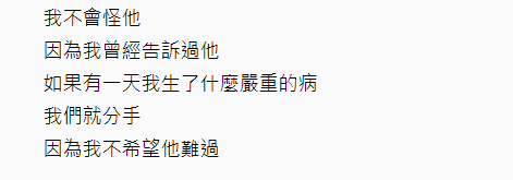 原PO知道,這做法並不是很好,可是他沒辦法想像到時候女友失去他時會有多痛,「我不想讓她看到做化.療沒頭髮的我,我不想讓她看到很痛苦的我,我不想看到她為我流淚,所以寶貝,對不起,我愛妳。」