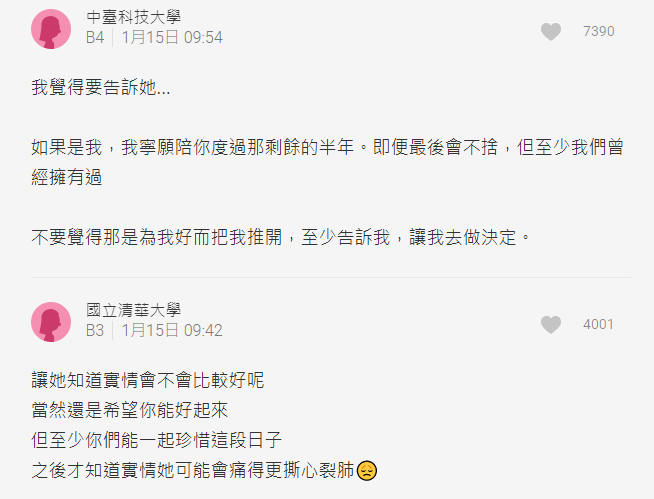文章曝光後,立刻引起熱烈迴響,許多網友認為應該要勇敢與女友說出實情,「如果是我,我寧願陪你度過那剩餘的半年。即便最後會不捨,但至少我們曾經擁有過。」、「真的愛你是會想陪你渡過任何時候,你不捨女友看到你生病的樣子,那女友又捨得你獨自一人過剩下的日子嗎」 、「不要自以為是對她好的去做選擇」、「我覺得你很自私」。