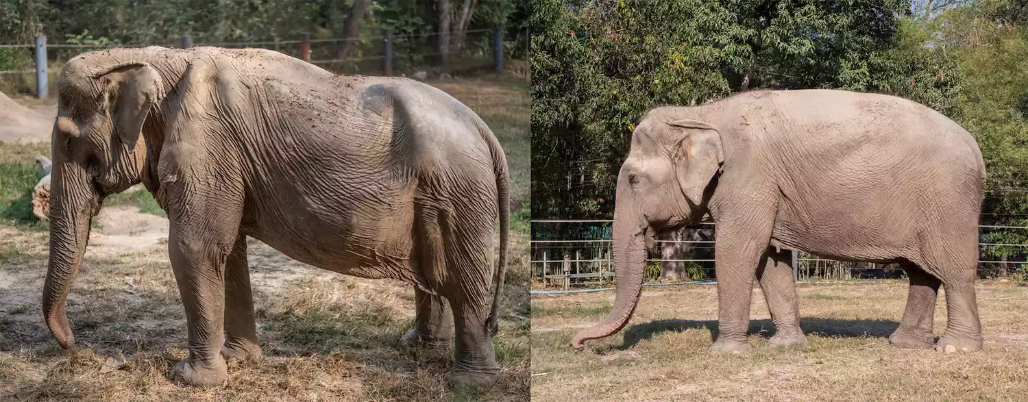只見照片中的派琳,因為被反覆承載遊客而導致牠的脊椎已經嚴重下凹,跟正常大象圓潤的曲線相比,顯然派琳的脊椎是塌陷的!由於這些載客的大象通常會在工作過程中不只是載客人,背上還得裝備個大座椅給人坐,還要有一位騎象人領導牠,這些額外的負重,都使得大象背部的組織和骨骼退化,導致不可逆的身體損傷;而不幸的是,WFFT就說這類型的傷害對那些長年載客大象來說是很常見的。