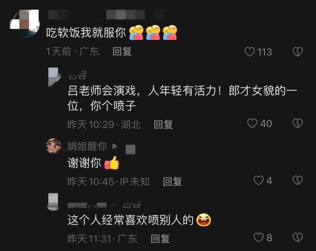 還有更直接的網友,直接說道:「吃軟飯我只服你。」暗指呂良偉是最會吃軟飯、佔妻子便宜的男人,然而身為資深影星,呂良偉面對負面評論卻毫不在意,從未理會或回應這些留言,眼見呂良偉沒有反應,更有理智的網友跳出來為他喊冤:「呂良偉演技好、人又隨和,並且年輕有活力,和妻子很配,郎才女貌。」想不到卻釣出了呂良偉的老婆親自回應。
