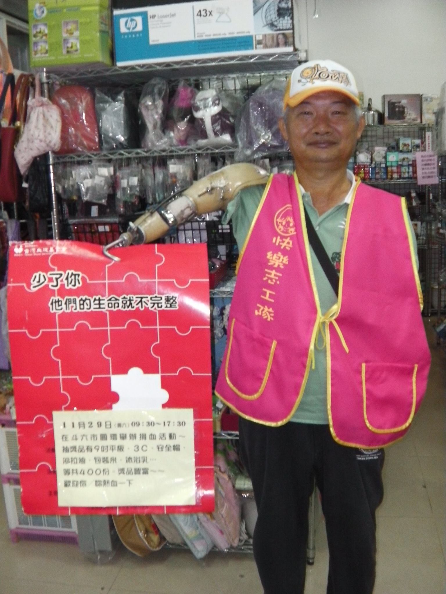 於是,李大哥便在老婆的推薦下,到斗六國中當導護志工,因為沒有手可以拿指揮旗,他便用身體幫學生擋車,發現身體不夠明顯,便請人特製一面小型指揮旗掛在義肢上,有10多年的時間更是風雨無阻,每天上、下學準時出現在斗六國中校門口,還曾獲選為斗六市好人好事代表。