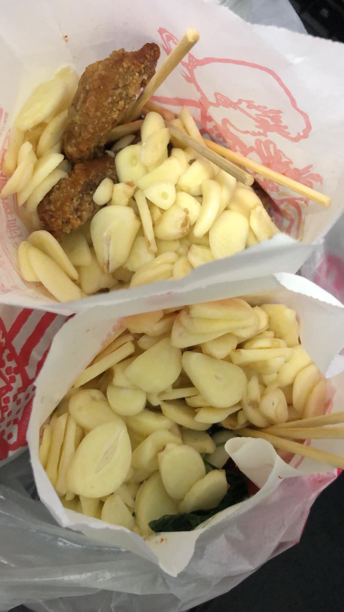 原來一打開紙袋就可以看到裡面加了滿滿的蒜瓣,老闆真的超大方不手軟,兩袋的蒜頭數量多到幾乎都要看不見鹹酥雞了啦XDD原PO一看也不可置信的大喊:「欸老闆我的鹹酥雞呢?」