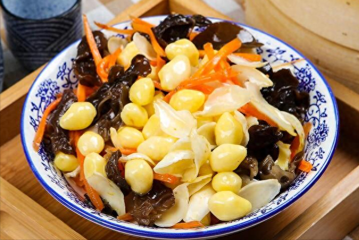 1. 白果剝去外殼,放入開水鍋中,煮5分鐘后撈出,百合泡發后切段,胡蘿蔔切絲,黑木耳泡發后撕成小片。