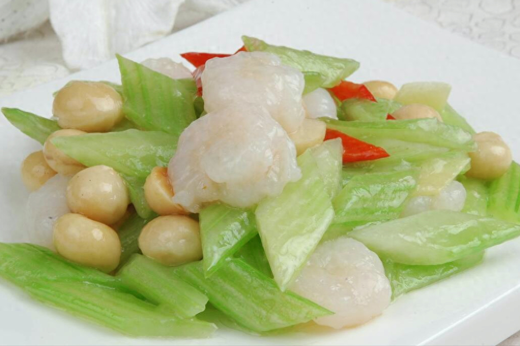 材料:芹菜200克、白果100克、鮮蝦仁150克、蒜瓣適量、生抽適量、鹽適量、食用油適量