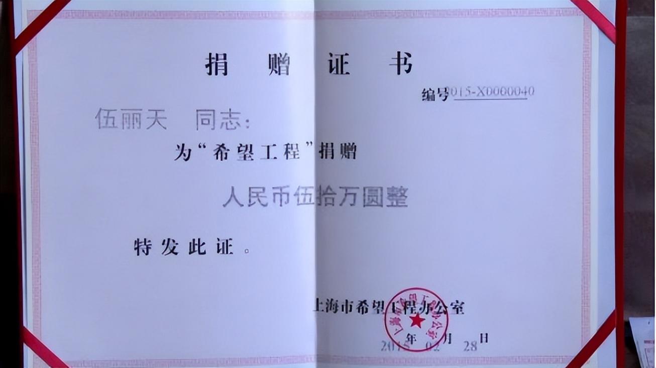 為了能捐獻這所學校,伍麗天將自己在上海市裡的房子給賣了。其中一百多萬(約500萬台幣)用來在崑山給自己買一個公寓,剩下的一半則全部捐到了上海市青少年發展基金會,在江西省都昌縣捐助了一所希望小學。