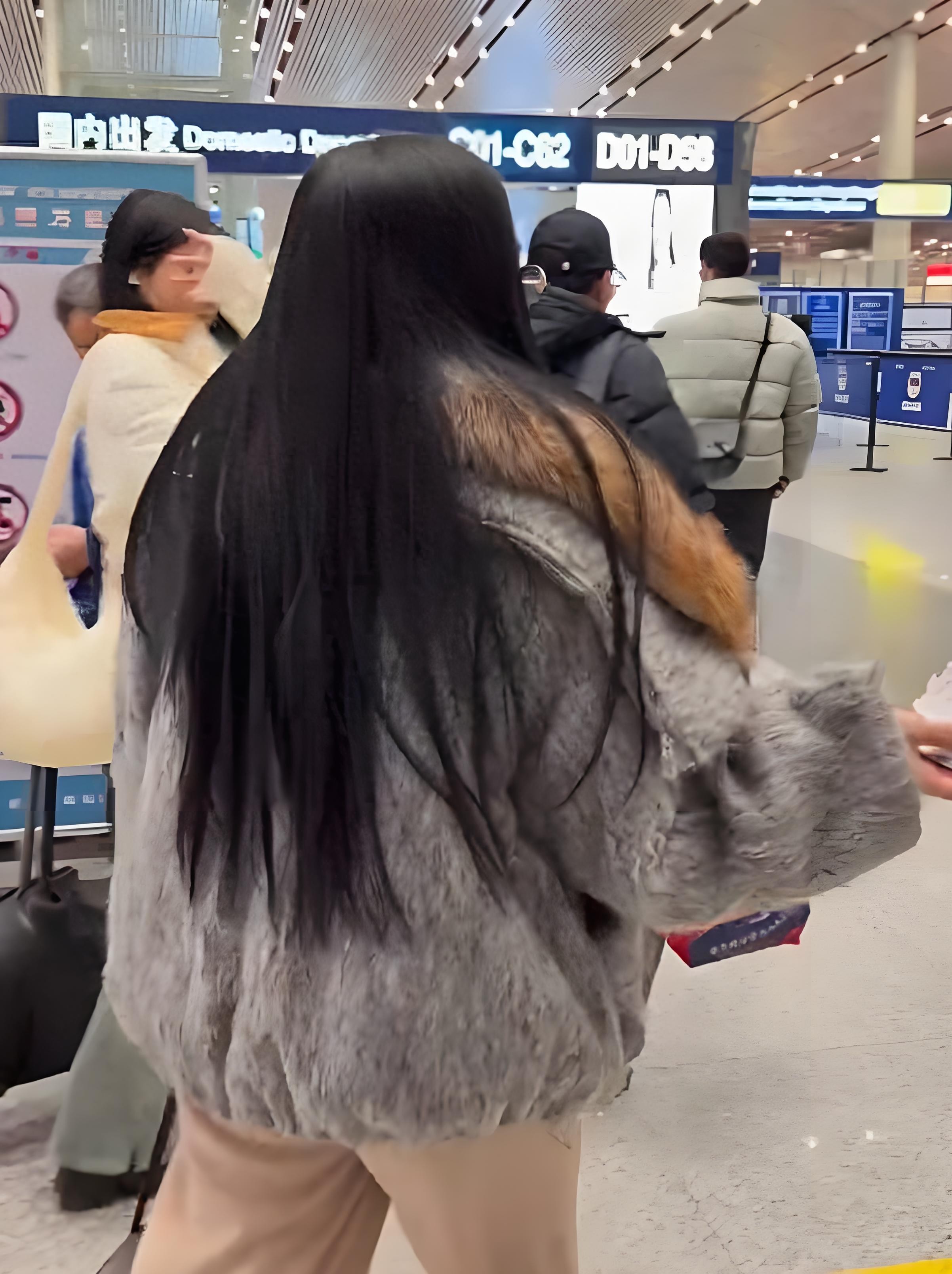 你看她這次穿的那件灰色皮草外套,其實皮草本身就有膨脹感,要是選不對款式,分分鐘顯胖10公斤。