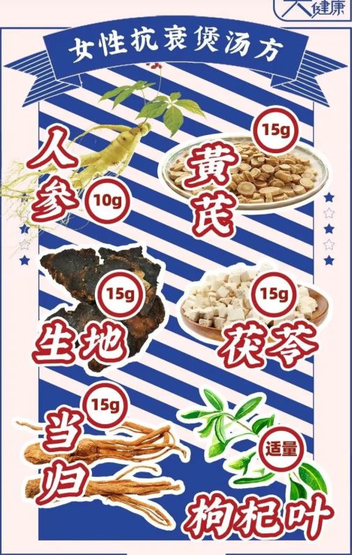 女性要抗衰老,核心就是要肝腎同補,所以在基礎方加上兩味藥材:當歸和枸杞葉。當歸能走能守,入肝能養血活血,入脾經能生化補血,補而不滯,為補血之要藥。枸杞葉中的黃酮類物質,有顯著的清除自由基、抗氧化、抗衰老作用。