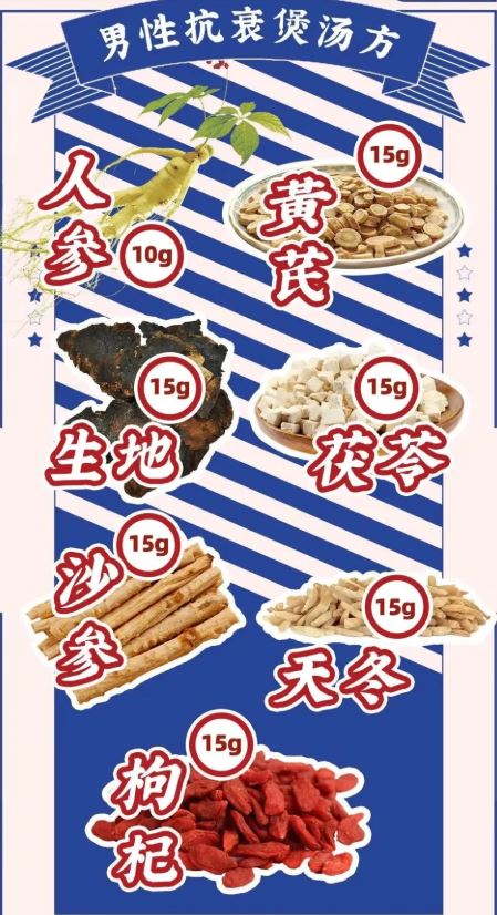 男性工作壓力大,脾氣暴躁,熬夜多,日常應酬多,不少人也喜歡喝酒抽煙,這些都很容易傷陰,尤其耗傷肺胃之陰,陰虛、陰精不足,無法滋養身體,就容易衰老。所以男性抗衰老的核心是脾腎同補,主要在補氣。在抗衰方中加入沙參和天冬,這一對藥透過滋陰生津,使陰精充沛,流動到達全身各處,滋養脾胃、肺腎等五臟六腑,實現其延緩衰老的作用。