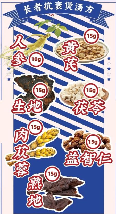 針對老年人最重要、最核心的就是補腎氣,因為年紀大了,腎氣不足,腎陰腎陽虧虛,這是老化的根本原因。這時候可以加入三味藥材,肉蓯蓉、益智仁和熟地。這三味藥有補腎陽、固腎氣、溫脾陽、養血滋陰、補精益髓、滋補肝腎的作用,能夠潤腸、改善大腦認知,對於老年人抗衰老最合適。