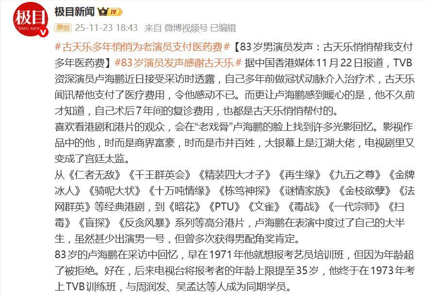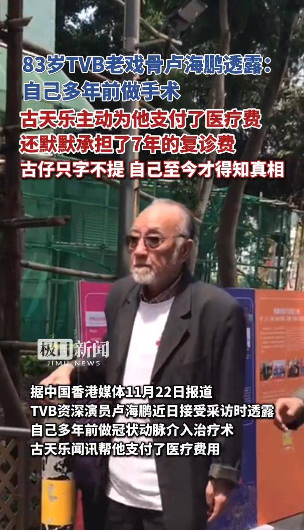 據11月24日報導,娛樂圈又悄然流傳開一則暖聞——83歲的TVB資深演員盧海鵬在採訪中透露,自己多年前接受心臟手術及術後七年的複診費用,竟全由古天樂默默承擔,而當事人直到最近才從第三方得知真相。