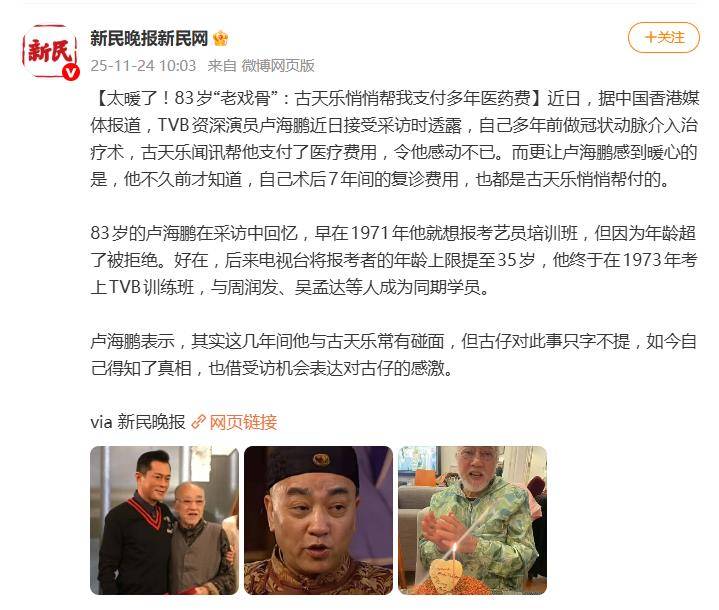 盧海鵬在採訪中追溯了更早的溫情片段:年輕時他與周潤發是TVB訓練班同窗,發哥曾督促他鍛煉身體對抗疾病;近年苗僑偉夫婦也曾助他治療眼疾。如今古天樂作為後輩,悄然接過了這份行業互助的接力棒,形成了一條跨越世代的守護鏈。