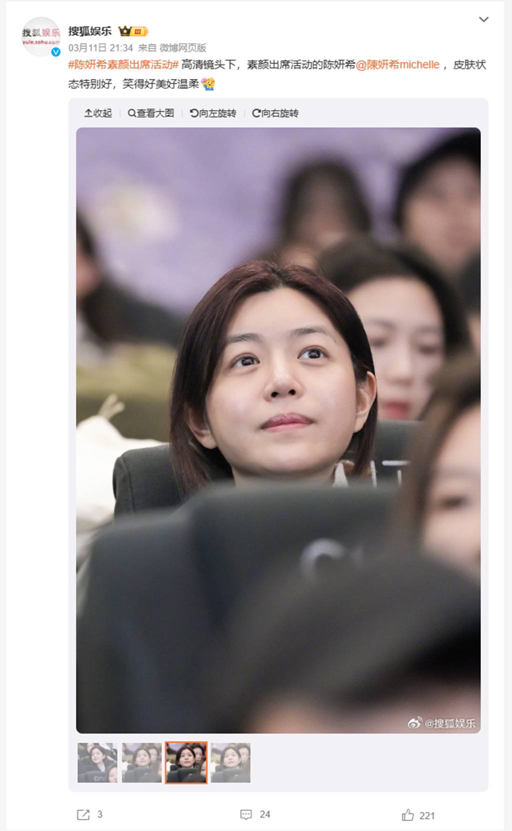 根據《三立娛樂星聞》報導,陳妍希以一身簡約時尚打扮出席活動,身穿藏青色大衣搭配貝雷帽,展現出全新面貌。雖然素顏出席,眼袋看起來有些浮腫,讓不少網友推測她這段時間可能經歷了不少情緒起伏。不過,令人意外的是,她的膚質依然白皙透亮,就算在高清的鏡頭拍攝下,整體氣色看上去依然非常好。