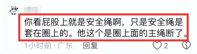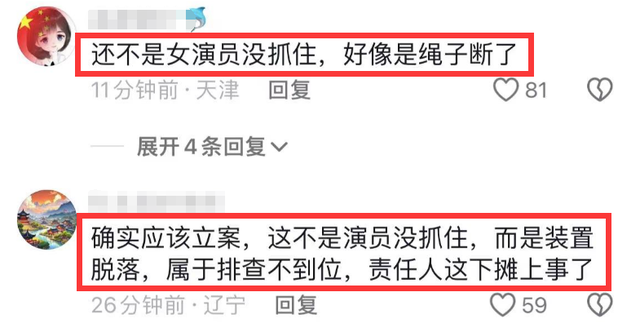 所以並非是這位女演員沒有抓住掉落,而是上面的繩子斷了導致裝置脫落,屬於嚴重的現場事故。