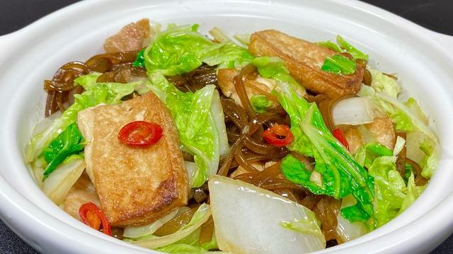 2、再把豆腐煎成金黃色盛出來,再開小火把肉片煸炒一下,再把姜蒜片、小米辣,蔥白也放進來,炒出香味。再把白菜倒入進來炒至斷生,調味放食應鹽,雞精,胡椒粉,白糖提鮮,蠔油提味,生抽翻炒均勻,把白菜炒至斷生。把豆腐,粉條,白菜倒入砂鍋中,倒入一碗清水,小火將它燒開,撒上蔥花點綴一下,豬肉白菜燉粉條就完成了。