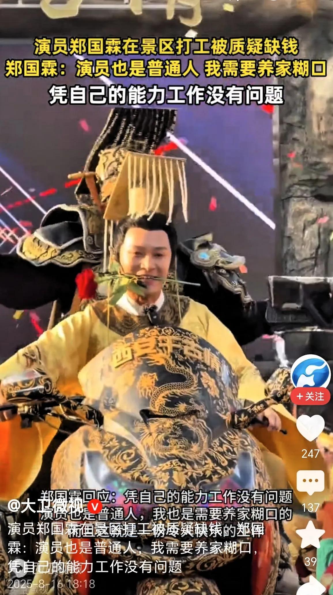 可現在他放下身段去景區工作,有人覺得他太「掉價」,其實這種偏見的背後,就是把職業分出了個三六九等,這種觀念根本就不對,演戲是工作,在景區表演也是工作,只要是勞動,就該被尊重。