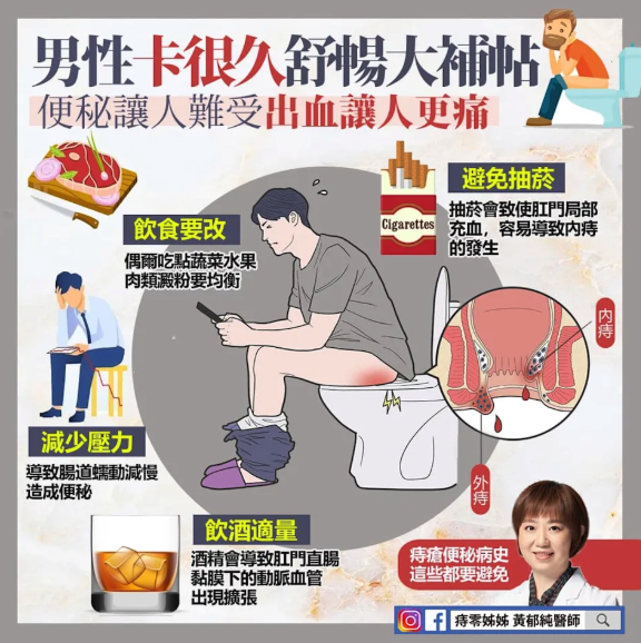有趣的是,門診觀察發現男性病患比例約佔三成,但實際上痔瘡的男女比例卻是一比一。造成這種現象的原因在於,男性因工作性質或生活方式,如長期使用3C產品、久坐久站等,容易造成腹部壓力過大,影響靜脈回流。