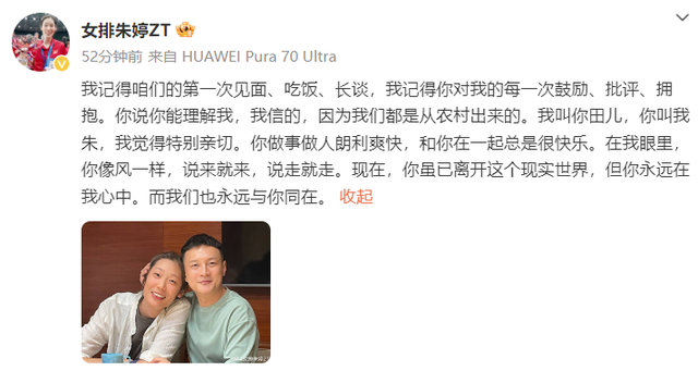 她發文悼念,直言我們都是從農村出來的,我叫你田兒,你叫我朱,我覺得特別親切,你做事做人郎利爽快,和你在一起總是和快樂,你雖已離開這個現實世界,但你永遠在我心中,而我們也永遠與你同在。