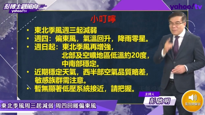 另外彭啟明也在YahooTV《彭博士觀風向》直播節目中表示,預計周日(5日)晚間會迎來新一波東北季風,到時候北部、東半部低溫下探剩1字頭,溫度下降很有感,會是入秋以來較強的一波,直到下週11月8日至9日溫度才會逐步回升。