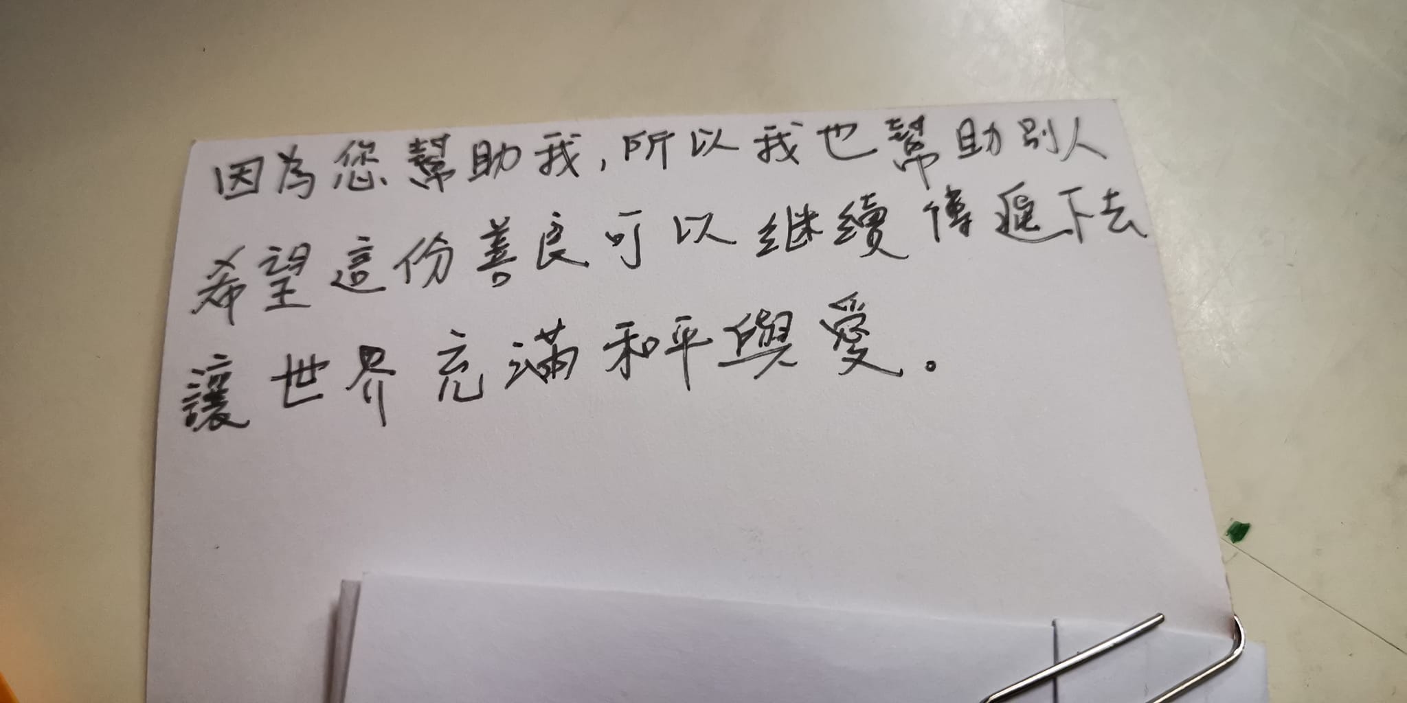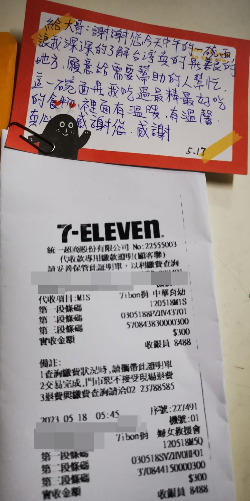 不僅如此,在卡片的背面,情侶倆表示:「因為您幫助我,所以我也幫助別人,希望這份善良可以繼續傳遞下去,讓世界充滿和平與愛!」接著附上了一張到便利商店捐款700元至慈善機構的收據。
