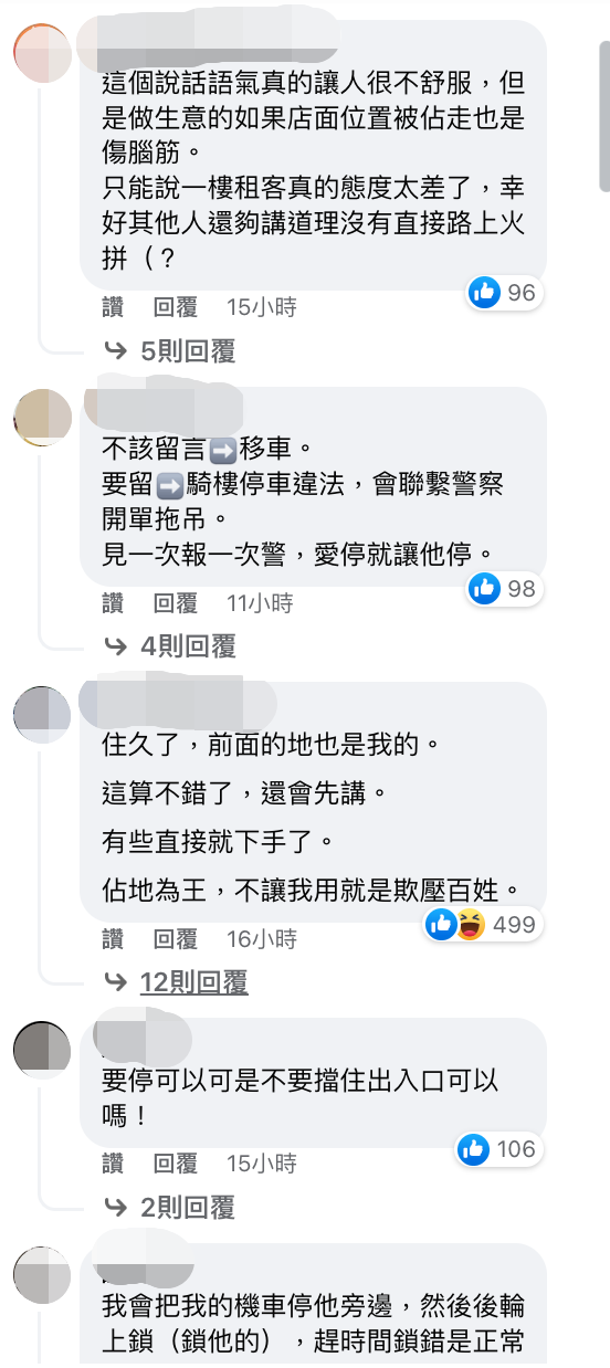貼文一出,引起兩派網友瘋狂討論:「還聽過住大樓的地下停車場機車格停了20年就是他的,別人都不准停!真的是佔地為王~無法根治!」、「要停可以,但是可以不要擋住出入口嗎」、「大家互相講一下就好,幹嘛要把人家車移到其他不ok的地方」、「這個說話語氣真的讓人很不舒服,但是做生意的如果店面位置被佔走也是傷腦筋。」