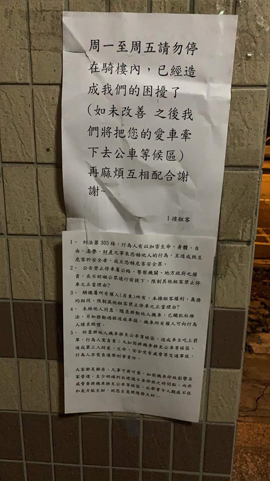 威脅要把愛車牽走!店家「不滿機車佔用騎樓」貼告示警告 騎士氣不過「超嗆法律式回擊」掀議論