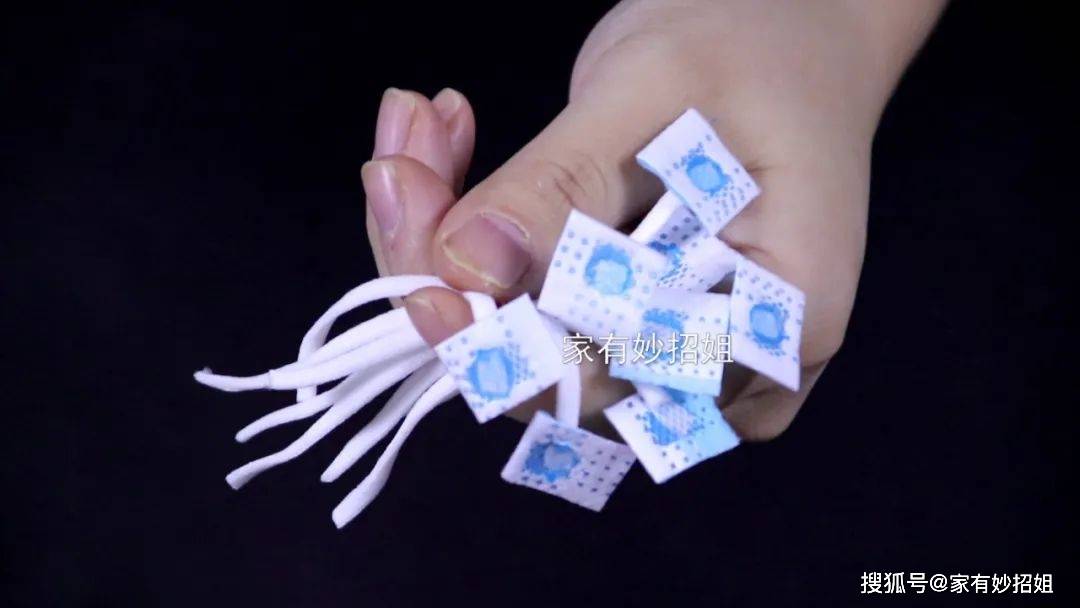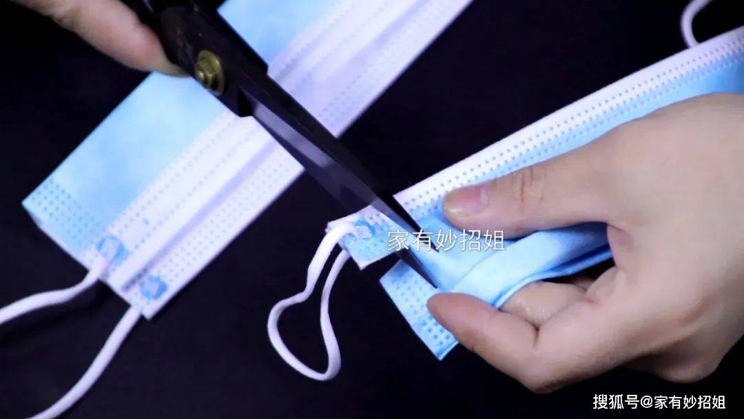 具體操作的方法非常簡單,先拿上兩個一次性口罩,在口罩的兩邊都是有掛耳繩的,我們用剪刀將上面的四個掛耳繩都給它剪下來。剪的時候,每根掛耳繩上都需要給它預留一點口罩布,這樣我們就得到了四根長長的掛耳繩。接下來,我們再將四根長掛耳繩從中間剪上一刀,它就變成八根短的掛耳繩了。剪好先放一邊備用。