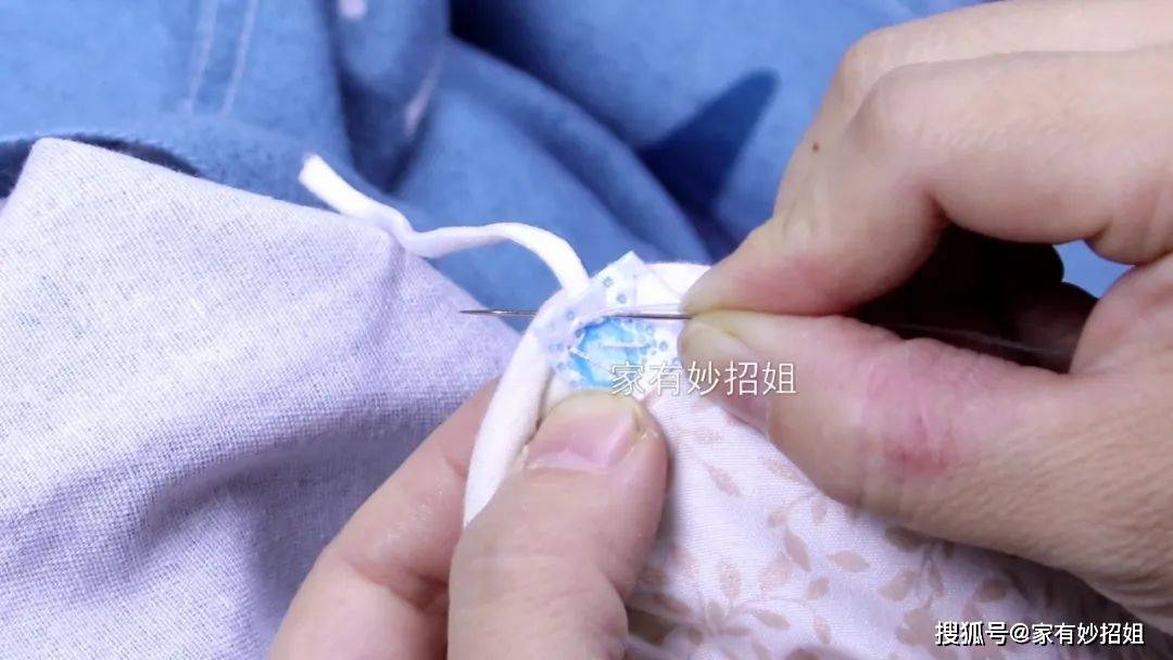 接下來,我們找到被芯的四個角,然後在這四個角的位置分別用針線縫上一個掛耳繩。剛剛的掛耳繩上,我們都有預留一點口罩布,就可以在預留的口罩布上縫針,把掛耳繩固定在被芯的四個角上。