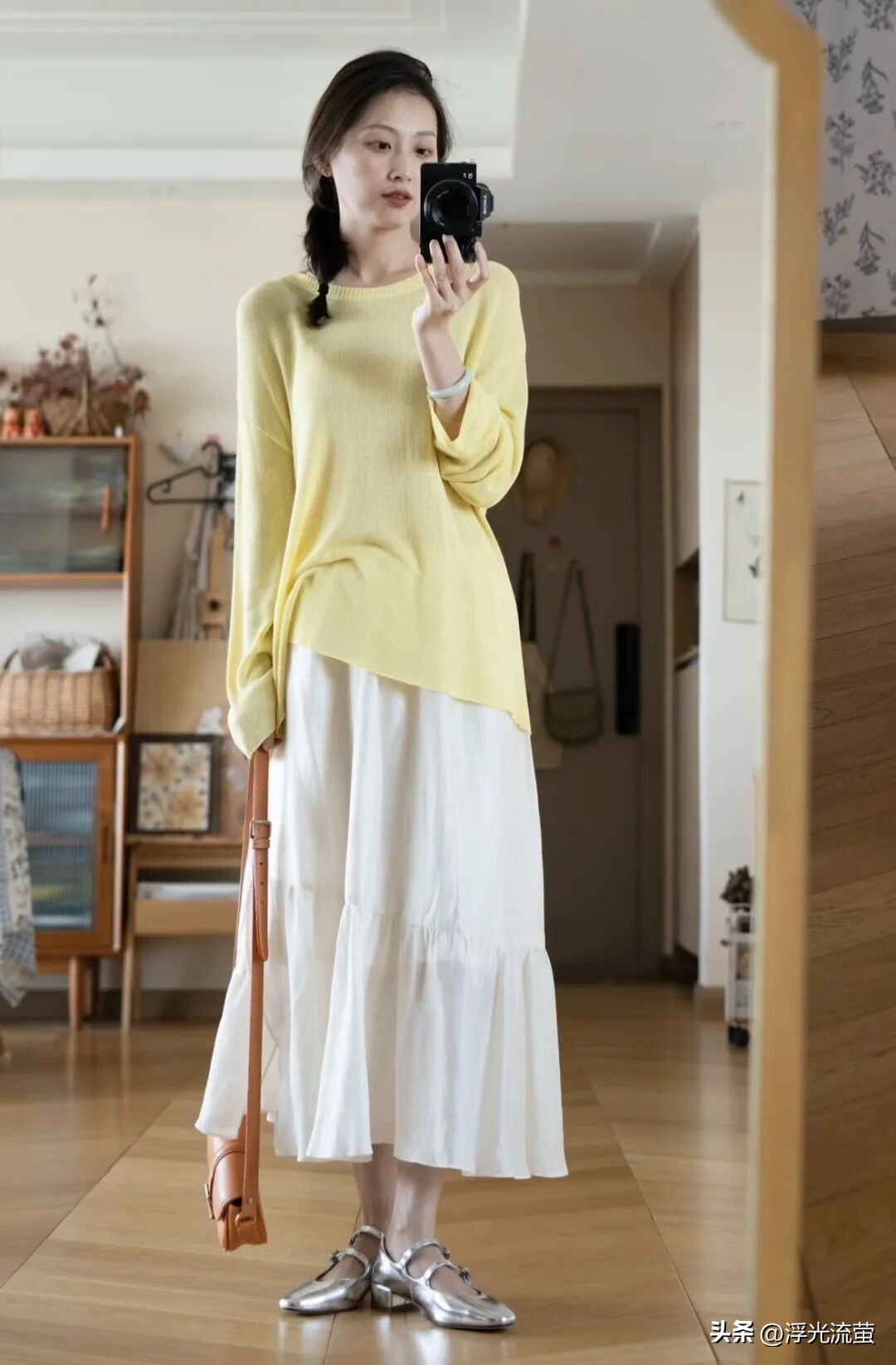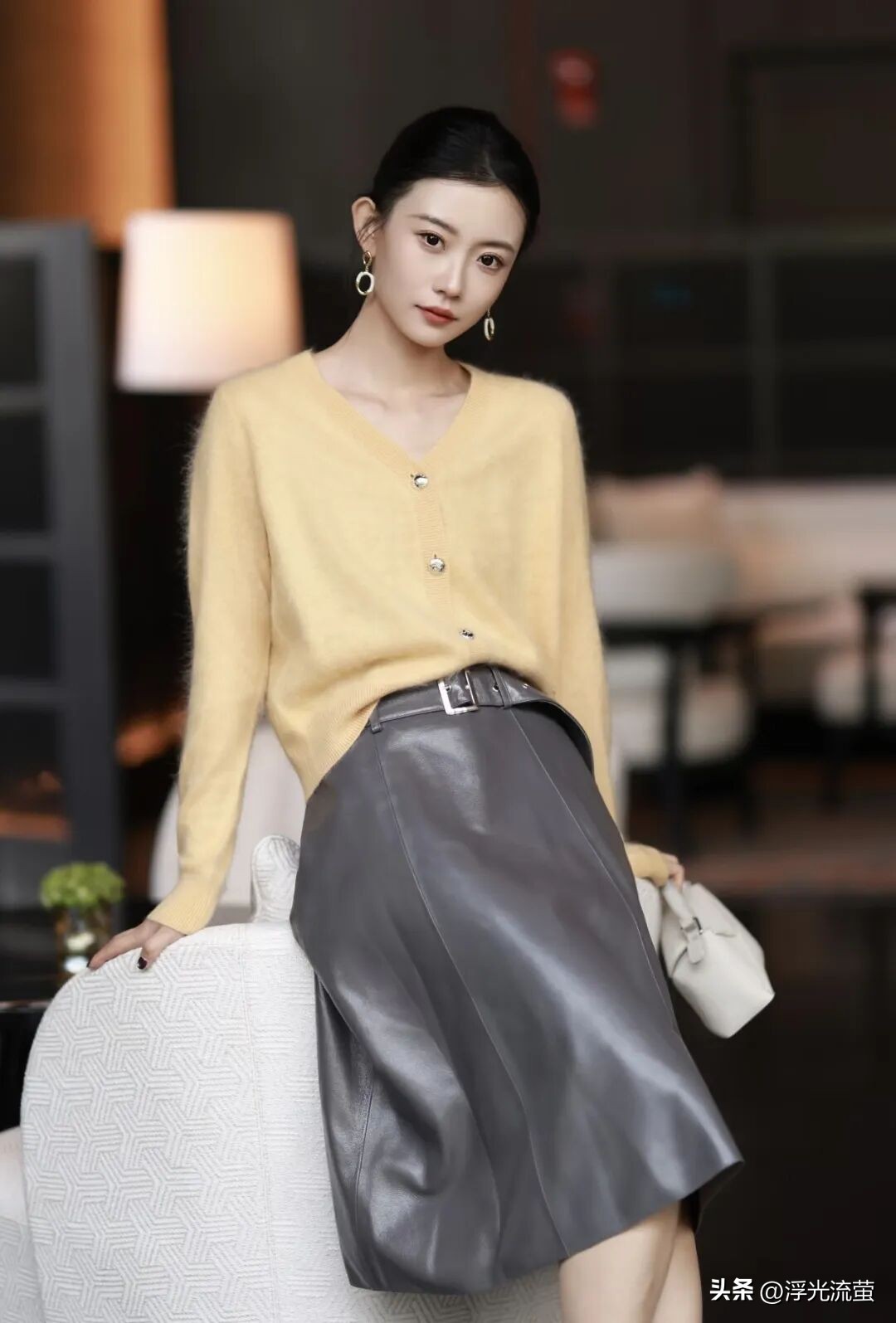 拿上面那位姐妹的穿搭來說的話,一件鵝黃色的V領毛絨長袖,下搭了一條皮質半裙。
