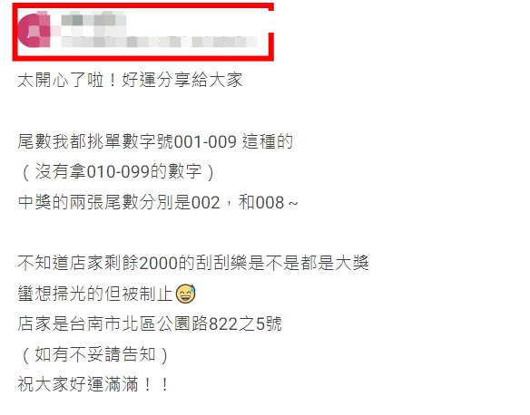 連續兩張都幸運刮中10萬元大獎,很多人都想問到底有什麼秘訣?她笑說自己是有一套規則的,主要就是「只挑個位數」,也就是每張彩券只會買「001~009」這9張,其中她又挑了偶數,最後買了002、008的刮刮樂,結果真的幸運抱走獎金,她也笑說,原本還想包下其它張,覺得是不是這間店都是大獎,結果被老闆阻止;很多網友看了都直呼羨慕,也留言:「回家要跟著做!」