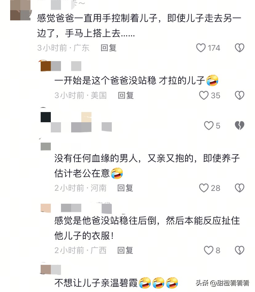 留言區有人說,看爸爸好像不高興兒子和媽媽太親密,一直在控制;也有人說是小孩沒站穩,爸爸扯著衣領拉了一把而已。大家怎麼看?