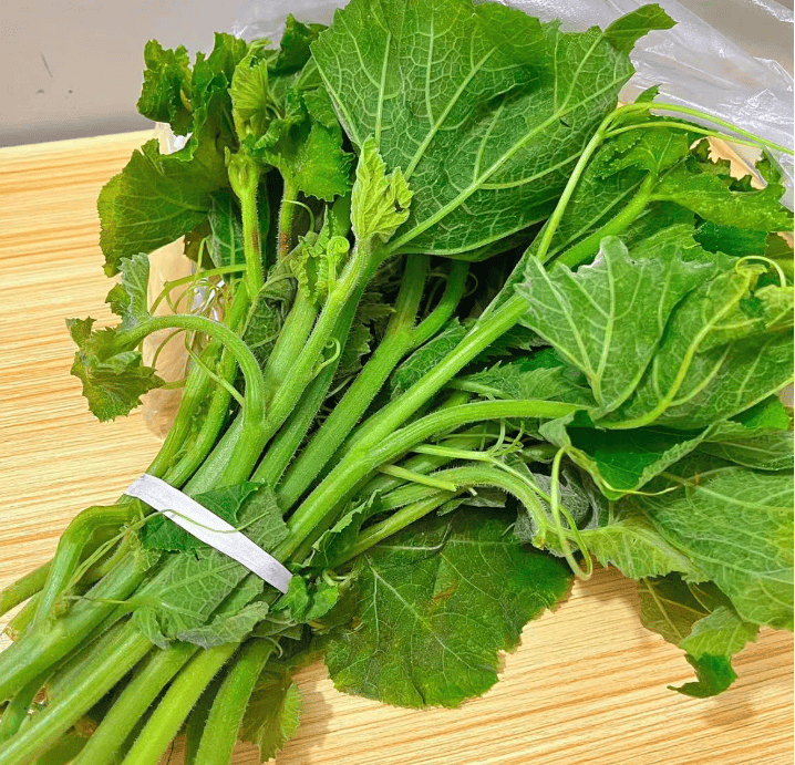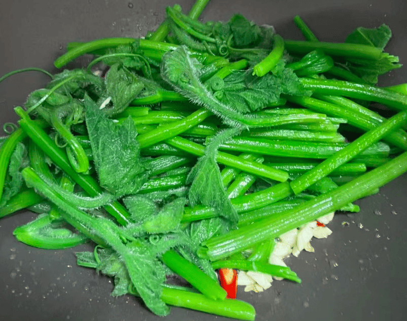 2、南瓜嫩尖撕掉絨毛,摘成小段清洗乾淨瀝乾水。