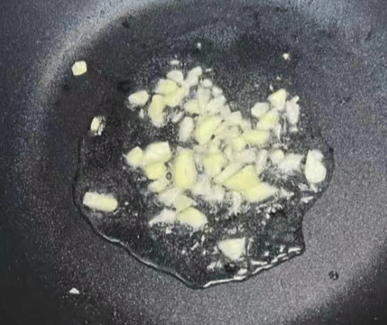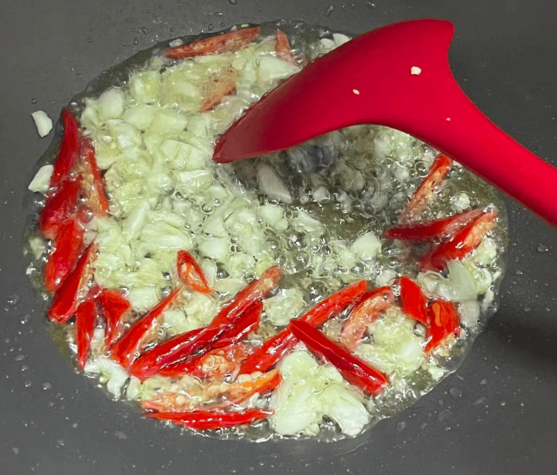 3、熱鍋涼油,下入大蒜和辣椒一起爆香。