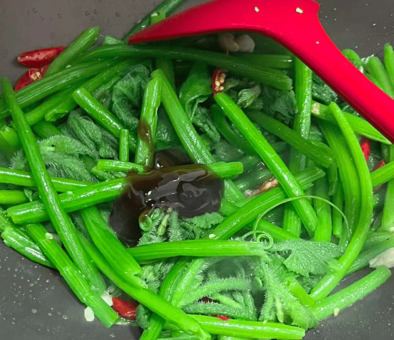 5、大火爆炒至斷生後,下入少許的蠔油,鹽調味提鮮,翻炒均勻即可。