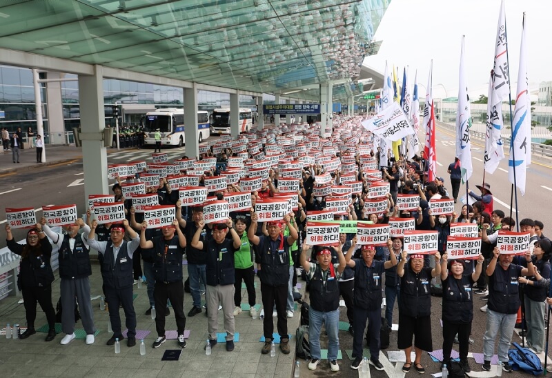 首當其衝的仁川國際機場,今日上午9時30分在第一航廈出境大廳舉行集會,現場約500名戴著「鬥爭」紅頭巾的勞工齊聚一堂。他們提出實施四班二輪制、增補人力、改善子公司員工待遇等多項訴求。