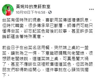 據《三立新聞網》報導,黃婉玲到知名的台菜餐廳用餐,她在臉書上分享,其實以「台菜」來說,每道菜背後都有隱含的意思,因此怎麼做菜、什麼場合送菜都是非常重要的,尤其很多知名的老店,大都會有這樣的概念,所以當時她看到老闆娘送上「酸筍炒腸」的時候,整個人都愣住了。