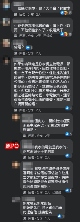 不過也有網友質疑,會不會是他關錯總電源?原PO也表示,因為他們公寓的電箱,都是設置在每戶自家門口,所以當天不可能有關掉鄰居總電源的疑慮,當時也問過對方是不是偷電,對方僅冷冷地說:「這些不重要!」不過目前也已經請水電來查清楚,希望可以早點釐清事情的真相。