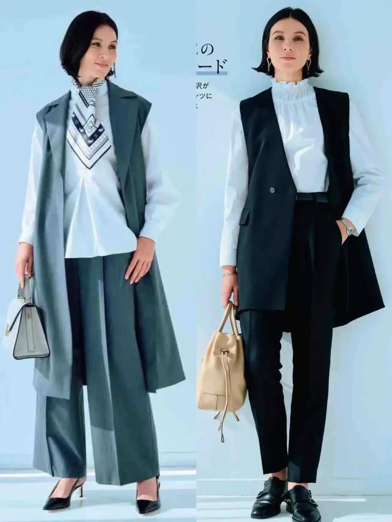 職場女性長相比較成熟,骨架比較大的情況下,我們還可以採用一件馬甲西服外套或者是馬甲風衣外套內搭白色襯衫,搭配上一款西裝褲,西裝闊腿褲,腳踩一雙高跟鞋,樂福鞋就可以給人的感覺就很乾練。