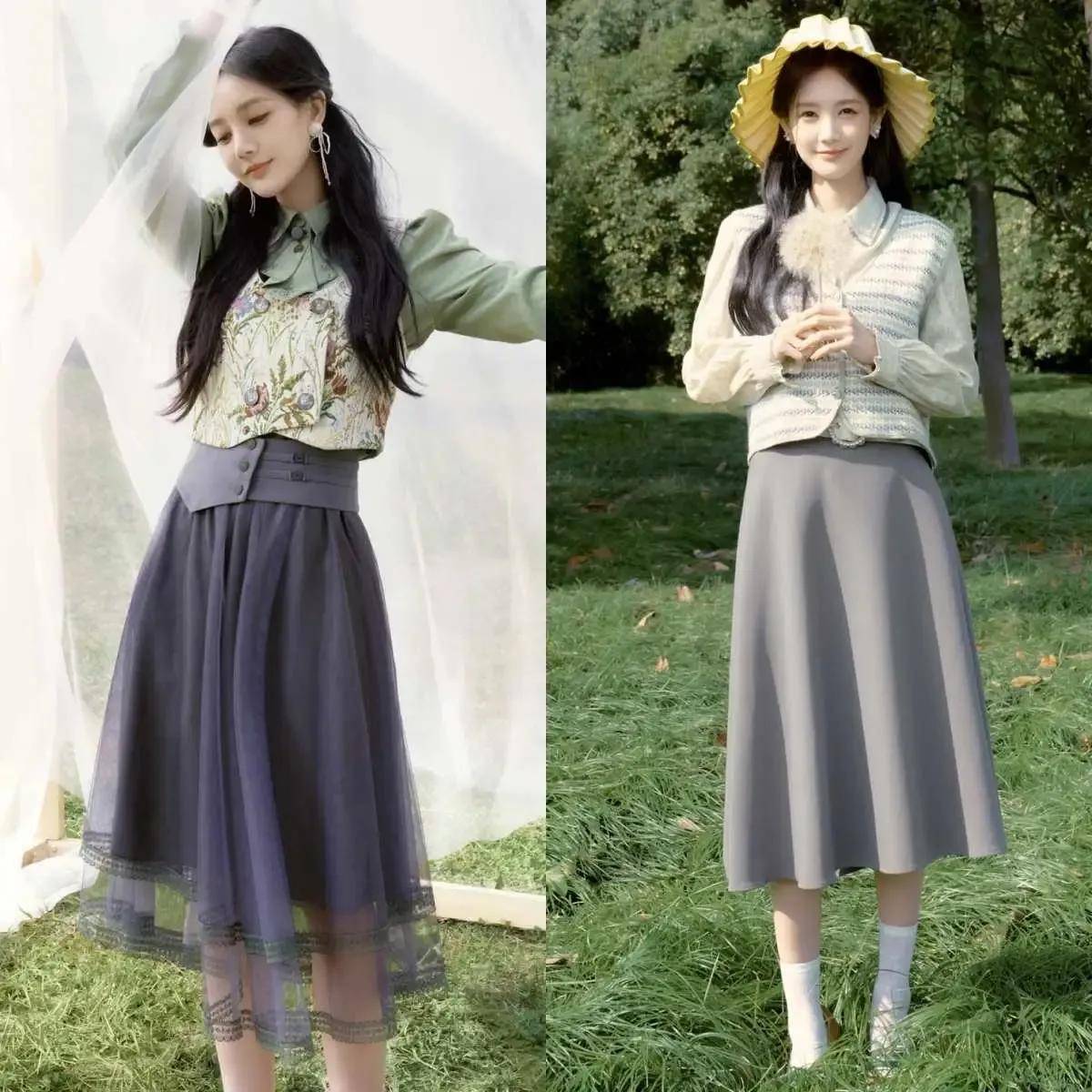 如果年齡是00後的情況下,這時我們選擇的穿搭風格就有所不同了,例如下面這兩套穿衣造型給人的感覺少女感直接拉滿一件中式風的小馬甲,內搭綠色的襯衫,加上一款紫色的薄紗半身裙,少女感直接撲面而來。